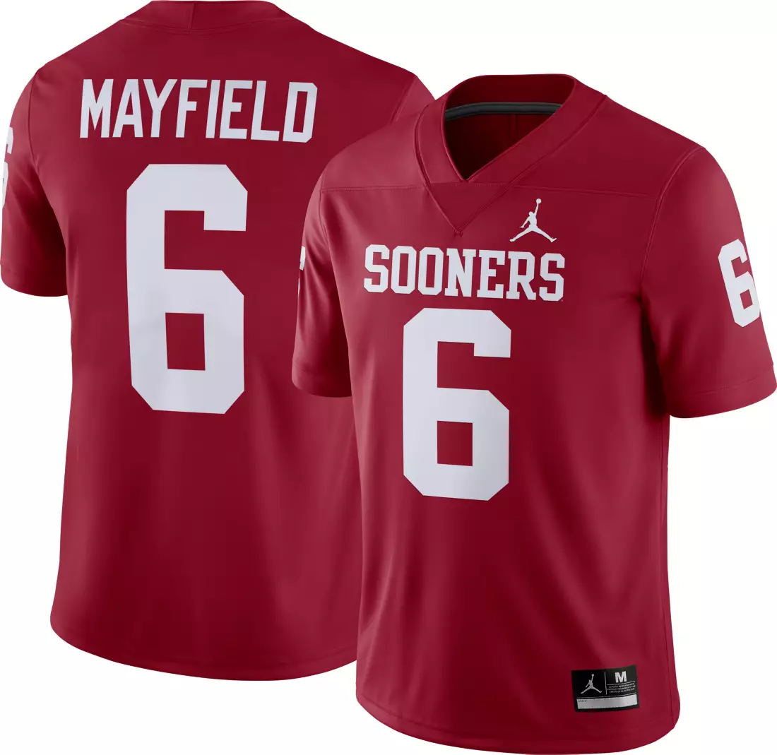Celebrate Baker Mayfield’s storied days at his alma mater with the Jordan® Men’s Baker Mayfield Oklahoma Sooners #6 Dri-FIT® Game Football Jersey.