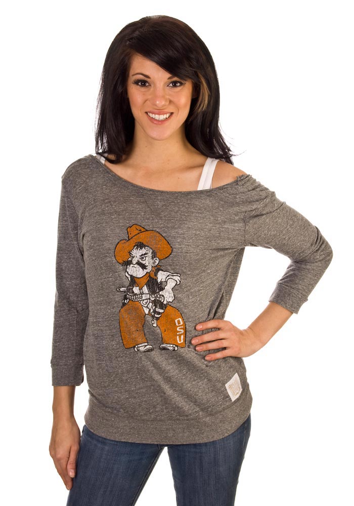 Display your Oklahoma State Cowboys spirit in this OSU Grey Tee! Featuring a semi deep scoop at the back collar and distressed team mascot logo at the front, this Oklahoma State Cowboys Long Sleeve Scoop Neck is a must-have for any fan. Go Pokes!